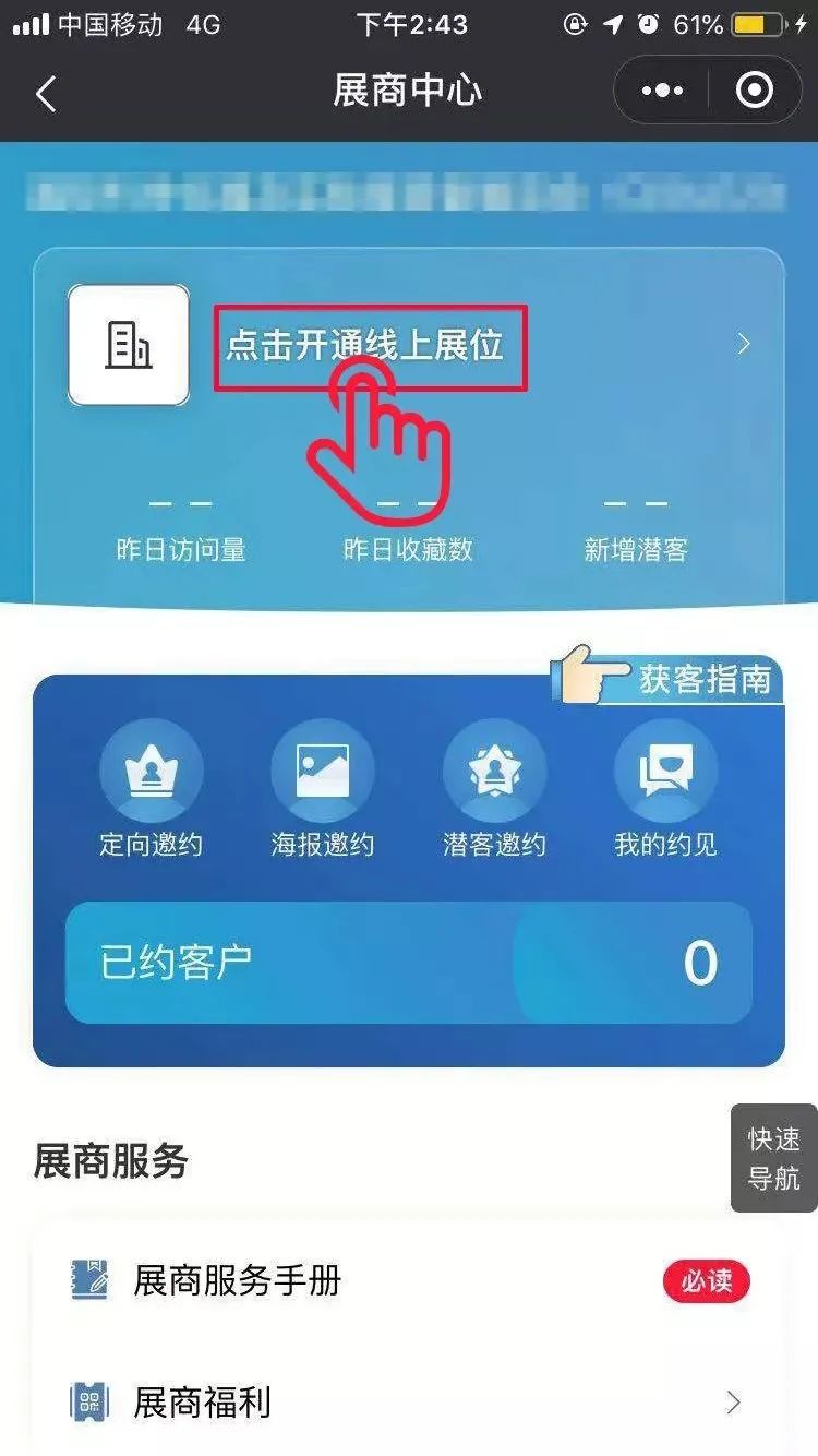 STEP 3: 進入展商中心頁,「點擊開通線上展位」,按頁面提示完善相關信息,經(jīng)組委會審核通過后,展位即在小程序首頁展示。