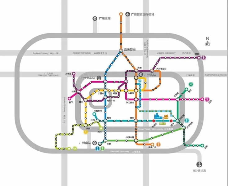 3號線(北延長線)機場北站(2號航站樓)/機場南站(1號航站樓)- 體育西路站(轉(zhuǎn)乘3號線) - 客村站(轉(zhuǎn)乘8號線)- 新港東站(廣交會展館A區(qū))。
