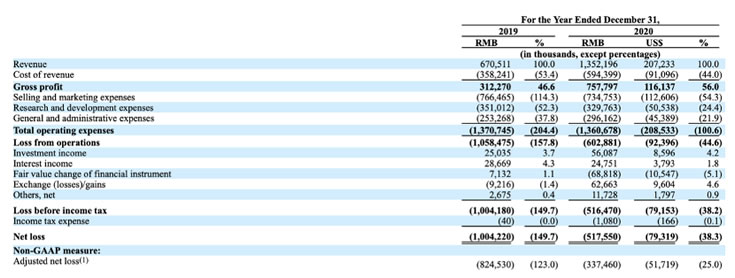 那么,這樣一家稀缺的互聯(lián)網(wǎng)公司,要如何撐起一個(gè)IPO?招股書顯示,知乎2020年總營(yíng)收為13.52億,相比2019年?duì)I收6.71億,同比增長(zhǎng)101.7%;全年毛利為7.58億,同比增長(zhǎng)142.7%;全年毛利率為56%,同比增長(zhǎng)20.2%。