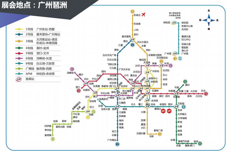 地鐵:3號線(北延長線)機場北站(2號航站樓)/機場南站(1號航站樓)- 體育西路站(轉乘3號線) - 客村站(轉乘8號線)- 新港東站A出口(廣交會展館A區(qū))。