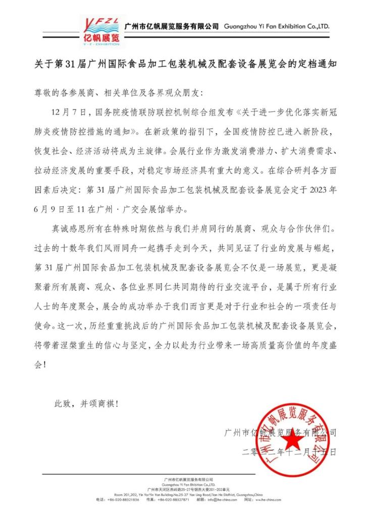 12月7日,國務(wù)院疫情聯(lián)防聯(lián)控機(jī)制綜合組發(fā)布《關(guān)于進(jìn)一步優(yōu)化落實(shí)新冠肺炎疫情防控措施的通知》。在新政策的指引下,全國疫情防控已進(jìn)入新階段,恢復(fù)社會(huì)、經(jīng)濟(jì)活動(dòng)將成為主旋律。會(huì)展行業(yè)作為激發(fā)消費(fèi)潛力、擴(kuò)大消費(fèi)需求、拉動(dòng)經(jīng)濟(jì)發(fā)展的重要手段,對(duì)穩(wěn)定市場(chǎng)經(jīng)濟(jì)具有重大的意義。在綜合研判各方面因素后決定:第31屆廣州國際食品加工包裝機(jī)械及配套設(shè)備展覽會(huì)定于2023年6月9日至11在廣州·廣交會(huì)展館舉辦。