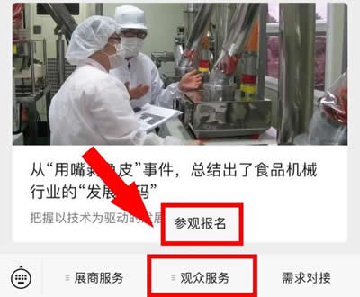 方法三:關(guān)注微信公眾號“IFPE食機(jī)展”,點(diǎn)擊下方菜單欄“觀眾服務(wù)”--“參觀報(bào)名”即可進(jìn)入報(bào)名系統(tǒng)。