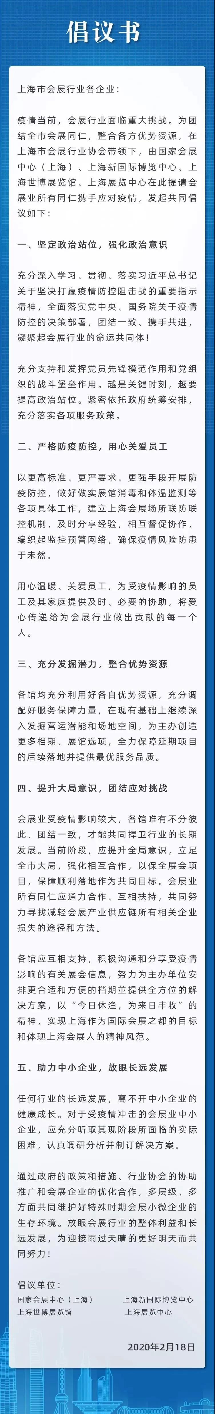 與此同時(shí),一份由國(guó)家會(huì)展中心(上海)提議、上海展覽業(yè)協(xié)會(huì)指導(dǎo),上海新國(guó)際博覽中心、世博展覽館、上海國(guó)際展覽中心昨天共同發(fā)起的倡議書,也向社會(huì)公開發(fā)布。《倡議書》明確“不讓任何一個(gè)受延期影響的展覽會(huì)因沒有檔期和場(chǎng)地而取消”。