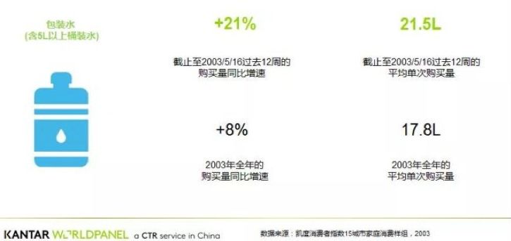 事實上,在2003年SARS期間,包裝水的銷量也在攀升。凱度消費者指數的分析揭示,2003年SARS感染高發(fā)期間,包裝水需求量凸起,尤其在北京,由于許多家庭紛紛在此期間進行大量囤貨,包裝水的購買量在2003年3-5月間增長了21%。