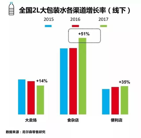 據尼爾森數據,盡管400-800ml的包裝水仍然主導市場,但2L以上大包裝增速尤其亮眼。2017年食雜店的銷量增長率達到了51%。