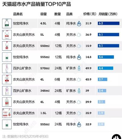 線下增速迅猛,線上更是成為消費主流。在天貓月銷量前10的水大體分為兩類,一類是4L左右的大桶裝,一類是小瓶礦泉水。其中,大桶裝水占據熱銷半數,而銷量領先的兩個產品都是4.5L以上的大桶水。