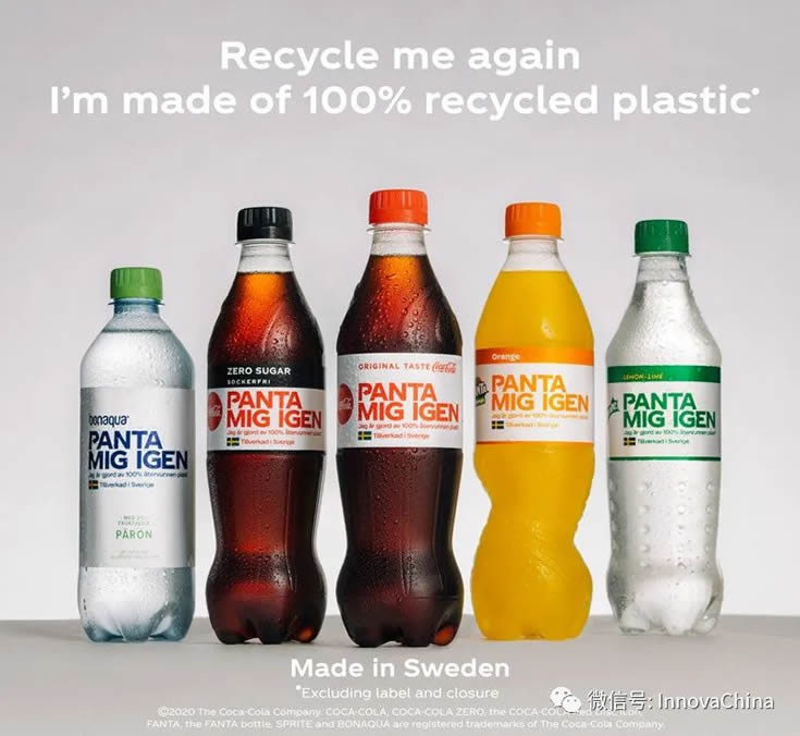 為實(shí)施這一簡單高效的策略,可口可樂設(shè)計(jì)了一套包裝可持續(xù)發(fā)展的溝通標(biāo)準(zhǔn),在2018年以前在包裝背面開始添加可回收說明的小圖標(biāo),到2018年在瓶蓋上標(biāo)注明確字樣“請回收”,2019年開始在包裝背面印上了醒目的標(biāo)語“我是100%可回收的”,下側(cè)則是可口可樂特別設(shè)計(jì)的可持續(xù)回收圖標(biāo)。另外,可口可樂瑞典公司今年將其完全回收的瓶子上的品牌標(biāo)志全部替換成了“請?jiān)俅位厥铡睒?biāo)語。