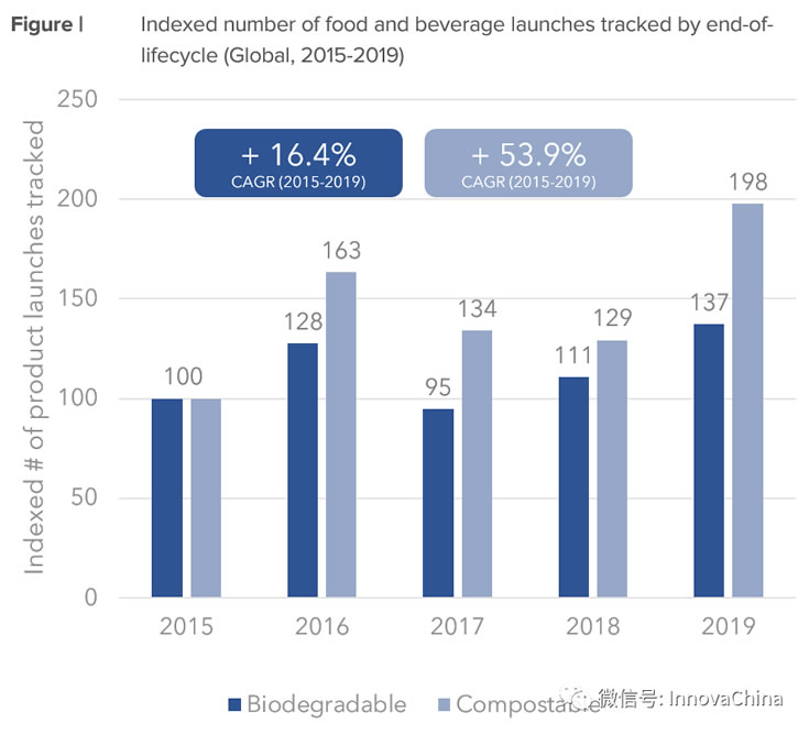 Innova Market Insights數(shù)據(jù)顯示,食品飲料新品中使用可降解包裝的年均復(fù)合增長率為16.4%,使用可堆肥包裝的產(chǎn)品年均復(fù)合增長率達(dá)53.9%(全球,CAGR [2015-2019])。帶有可堆肥包裝宣稱的食品飲料新品中超過50%都屬于零食和糖果品類。
