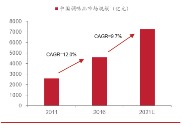 根據(jù)Frost & Sullivan 的數(shù)據(jù),2011-2016 年我國調(diào)味品市場規(guī)模從2588 億增長至4568 億元,CAGR為12.0%;預計2016-2021 年的CAGR 為9.7%,保持穩(wěn)健增長趨勢,至2021 年市場規(guī)模將達到7270 億元。