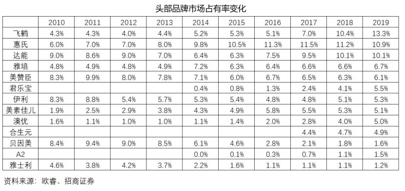 同時(shí),中國奶粉市場集中度進(jìn)一步提升,頭部品牌的競爭也越來越激烈。根據(jù)歐睿和招商證券的數(shù)據(jù)顯示,飛鶴的市場占有率排名第一,達(dá)到13.3%;惠氏占有率排名第二,達(dá)到10.9%;達(dá)能占有率排名第三,達(dá)到10.1%。