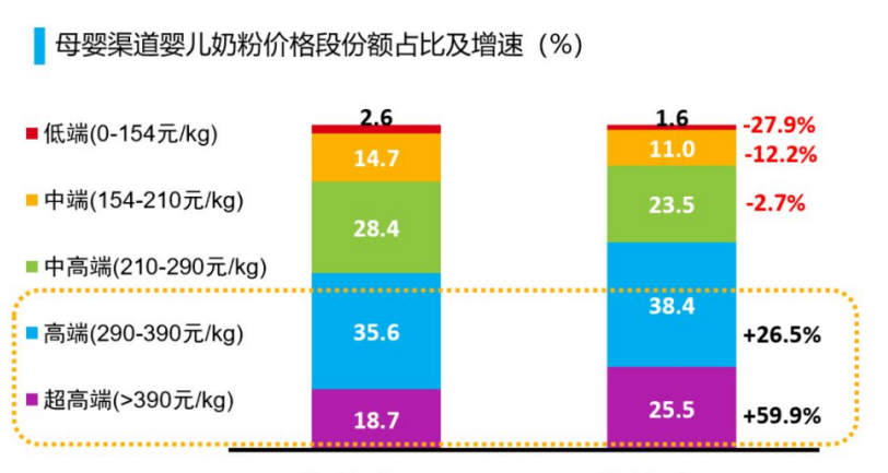 從2018年開始,高端和超高端奶粉開始爆發(fā),無論是國產(chǎn)品牌,還是外資品牌,諸如飛鶴星飛帆、惠氏啟賦等定位高端的品類銷量一路高歌猛進(jìn)。尼爾森研究顯示,奶粉市場品牌集中度不斷提高,高端嬰幼兒奶粉市場呈現(xiàn)出了極大的發(fā)展?jié)摿?,嬰幼兒奶粉品類中,超高端奶粉增速達(dá)到了60%。