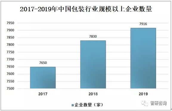 隨著中國(guó)包裝工業(yè)的快速發(fā)展,包裝生產(chǎn)在促進(jìn)國(guó)民經(jīng)濟(jì)建設(shè)、改善 人民群眾物質(zhì)文化生活中的地位作用的日益顯現(xiàn),包裝產(chǎn)業(yè)作為一個(gè)獨(dú)立的行業(yè)體系,其發(fā)展已被列入國(guó)民經(jīng)濟(jì)和社會(huì)發(fā)展規(guī)劃。2019年中國(guó)包裝行業(yè)規(guī)模以上企業(yè)數(shù)量7916家,比2018年中國(guó)包裝行業(yè)企業(yè)數(shù)量增加86家。