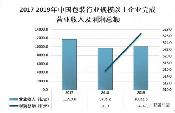 面對(duì)復(fù)雜多變的外部形勢(shì),包裝行業(yè)總體保持了平穩(wěn)運(yùn)行。2019年包裝行業(yè)規(guī)模以上企業(yè)營(yíng)業(yè)收入為10032.5億元,同比增長(zhǎng)3.4%;中國(guó)包裝行業(yè)規(guī)模以上利潤(rùn)總額為526.8億元,同比增長(zhǎng)2.2%。