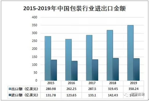 隨著我國(guó)對(duì)外貿(mào)易規(guī)模的不斷擴(kuò)大,包裝行業(yè)出口市場(chǎng)也表現(xiàn)活躍。我國(guó)包裝行業(yè)出口不斷增加。2019年中國(guó)包裝行業(yè)出口金額為350.24億美元,同比增長(zhǎng)9.64%;中國(guó)包裝行業(yè)進(jìn)口金額為140.4億美元,同比下降1.43%。