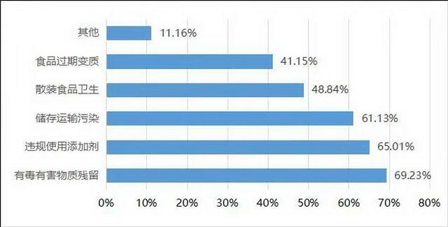 消費者最擔心哪些食品安全問題?調查結果顯示,受訪者最擔心的食品安全問題是有毒有害物質殘留,其次是違規(guī)使用添加劑,二者占比分別為69.23%和65.01%。另有61.13%的受訪者最擔心儲存運輸污染,48.84%受訪者最擔心散裝食品衛(wèi)生問題,還有41.15%的受訪者表示最擔心食品變質過期。