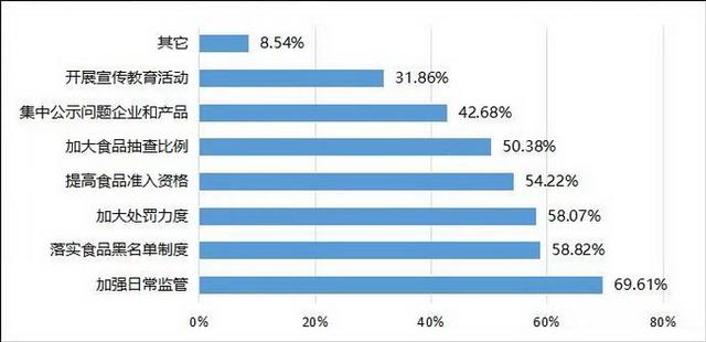 希望監(jiān)管部門如何解決食品安全問題?調查結果顯示,69.61%的受訪者希望監(jiān)管部門加強日常監(jiān)管,58.82%的受訪者希望落實食品黑名單制度,58.07%的受訪者希望加大處罰力度,54.22%的受訪者希望提高食品準入資格,50.38%的受訪者希望加大食品抽查比例,42.68%的受訪者希望集中公示問題企業(yè)和產(chǎn)品。