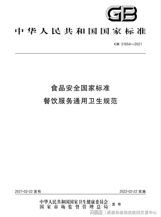 2021年2月22日國(guó)家發(fā)布《GB 31654-2021 食品安全國(guó)家標(biāo)準(zhǔn) 餐飲服務(wù)通用衛(wèi)生規(guī)范》,本標(biāo)準(zhǔn)規(guī)定了餐飲服務(wù)活動(dòng)中食品采購(gòu)、貯存、加工、供應(yīng)、配送和餐(飲)具、食品容器及工具清洗、消毒等環(huán)節(jié)場(chǎng)所、設(shè)施、設(shè)備、人員的食品安全基本要求和管理準(zhǔn)則,其適用于餐飲服務(wù)經(jīng)營(yíng)者和集中用餐單位的食堂從事的各類(lèi)餐飲服務(wù)活動(dòng),如有必要制定某類(lèi)餐飲服務(wù)活動(dòng)的專(zhuān)項(xiàng)衛(wèi)生規(guī)范,應(yīng)當(dāng)以本標(biāo)準(zhǔn)作為基礎(chǔ)。