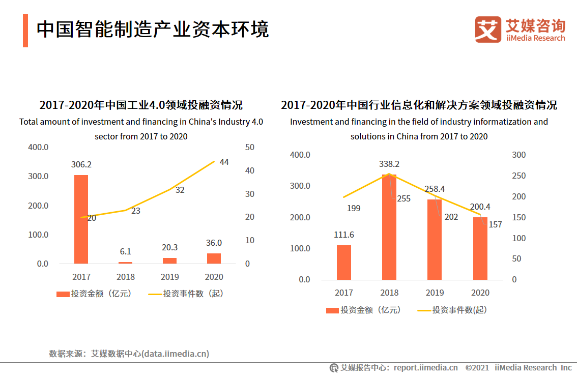 iiMedia Research(艾媒咨詢)數(shù)據(jù)顯示,中國工業(yè)4.0的投資金額和投資事件數(shù)從2018年的6.1億元和23起回暖至2020年的36.0億元和44起;而中國行業(yè)信息化和解決方案領(lǐng)域投融金額和數(shù)量從2018年338.2億元和255起逐步減至200.4億元和157起。資本在工業(yè)4.0領(lǐng)域的投資逐漸回歸理性,已經(jīng)建成護(hù)城河的企業(yè)將更受資本青睞;而中國行業(yè)信息化和解決方案領(lǐng)域已具一定成熟度,融資目的將更加集中于增加企業(yè)核心優(yōu)勢。