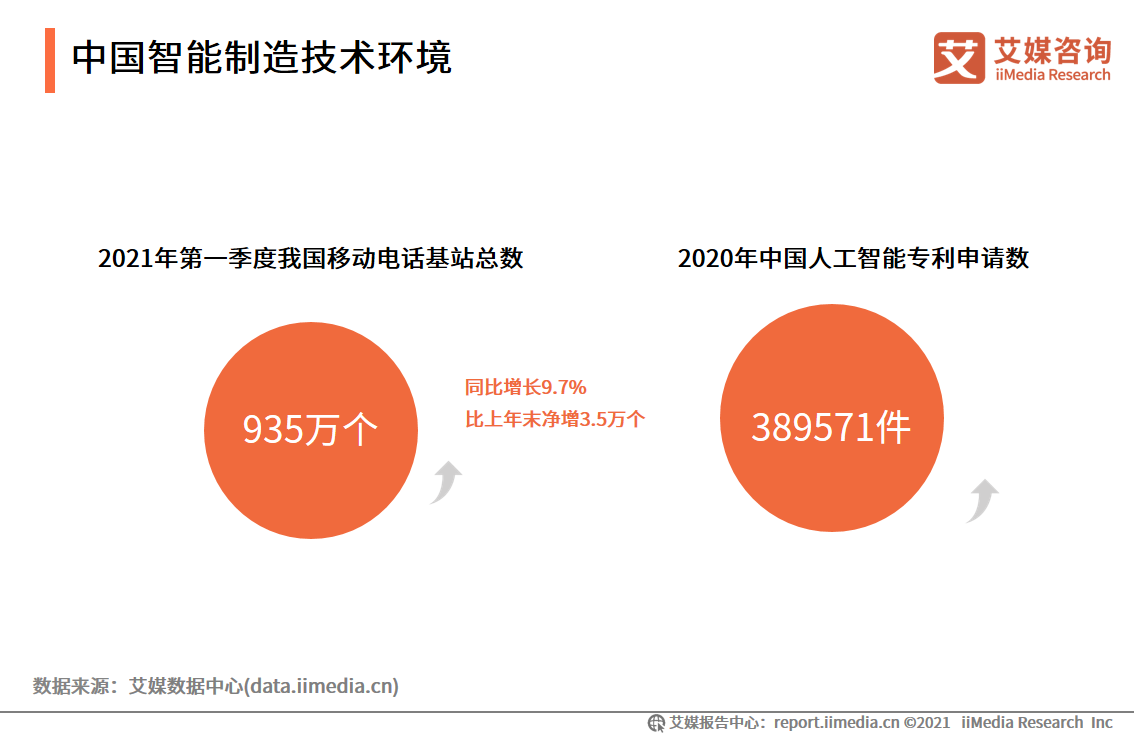 iiMedia Research(艾媒咨詢)數(shù)據(jù)顯示,截至3月末,我國移動電話基站總數(shù)達(dá)935萬個,同比增長9.7%,比上年末凈增3.5萬個。其中,5G基站總數(shù)81.9萬個,其中1-3月新建4.8萬個。2021年第一季度移動電話基站數(shù)量將增加至935萬個,為信息傳輸?shù)於ɑA(chǔ);人工智能研發(fā)依然保持火熱,專利申請量達(dá)到389571件,位居世界第一,占全球總量74.7%。艾媒咨詢分析師認(rèn)為,5G、人工智能、工業(yè)互聯(lián)網(wǎng)和大數(shù)據(jù)等技術(shù)的逐步成熟,為中國智能制造產(chǎn)業(yè)發(fā)展打造了良好的技術(shù)環(huán)境。
