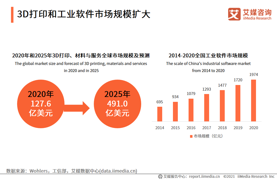 iiMedia Research(艾媒咨詢)數(shù)據(jù)顯示,2020年全球3D打印、材料與服務(wù)全球市場規(guī)模達(dá)到了127.6億美元,預(yù)計將在2025年暴增至491.0億美元;而全國工業(yè)軟件市場規(guī)模增長勢頭強勁,從2014年的695億元上升至2020年的1974億元。3D打印可以在智能制造的定制化生產(chǎn)、供應(yīng)鏈管理、產(chǎn)品設(shè)計、提高上市速度等方面發(fā)揮作用,目前已經(jīng)在智能醫(yī)療、智能新零售、智能設(shè)計等領(lǐng)域應(yīng)用;工業(yè)互聯(lián)網(wǎng)主要是由工業(yè)平臺為企業(yè)提供定制化的服務(wù),幫助企業(yè)上云,是實現(xiàn)智能制造的發(fā)展模式和現(xiàn)實的路徑。隨著3D打印和工業(yè)互聯(lián)網(wǎng)的規(guī)模進(jìn)一步擴大,中國制造業(yè)智能化也將蓬勃發(fā)展。