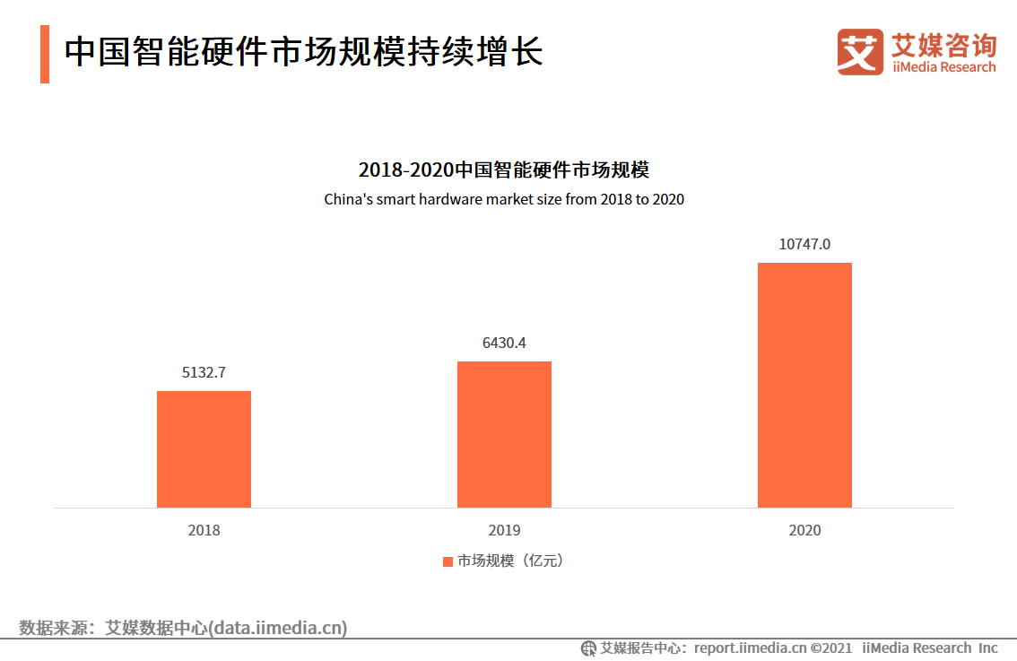 中國智能硬件行業(yè)利用傳感器等硬件技術(shù)對工業(yè)設(shè)備進(jìn)行智能改造,賦予設(shè)備大數(shù)據(jù)等附加價值,市場規(guī)模逐步上漲,從2018年的5132.7億元上漲至2019年的6430.4億元,在2020年市場規(guī)模以同比67.1%的增長率擴張至10747.0億元。艾媒咨詢分析師認(rèn)為,隨著公有云和信息傳輸技術(shù)的發(fā)展,已經(jīng)逐步普及“云+端”技術(shù)模式的智能硬件市場將進(jìn)一步擴張。