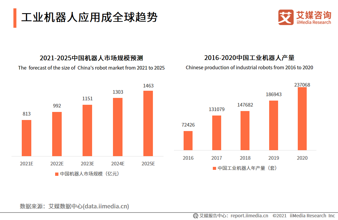 iiMedia Research (艾媒咨詢)數(shù)據(jù)顯示,中國機器人市場規(guī)模將在2021年達(dá)到813億元,隨后四年里也將保持增長勢頭,在2025年將漲至1463億元;而中國的工業(yè)機器人產(chǎn)量也從2016年的72426套擴張至2020年的237068套。24小時高效工作、智能化、數(shù)字化的工業(yè)機器人的應(yīng)用逐漸成為制造業(yè)產(chǎn)業(yè)的主流趨勢。