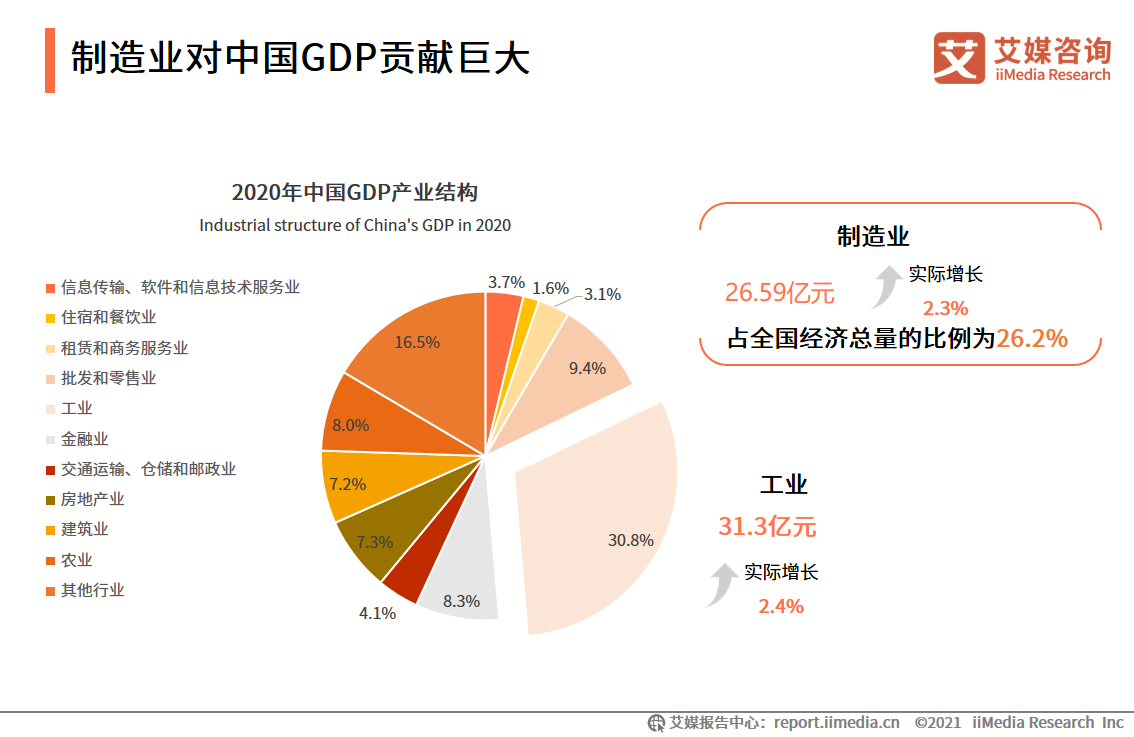 制造業(yè)對中國GDP貢獻(xiàn)巨大。2020年,中國創(chuàng)造的GDP總量突破100萬億元,實際增長2.3%。工業(yè)行業(yè)完成的GDP為31.3億元,占全國經(jīng)濟總量的30.8%,實現(xiàn)了2.4%的增長。其中,制造業(yè)完成的GDP為26.59億元,實際增長2.3%,占全國經(jīng)濟總量的比例為26.2%。在雙循環(huán)制度提出和供給側(cè)結(jié)構(gòu)性改革的大背景下,制造業(yè)對全國經(jīng)濟的重要性將進(jìn)一步提高。
