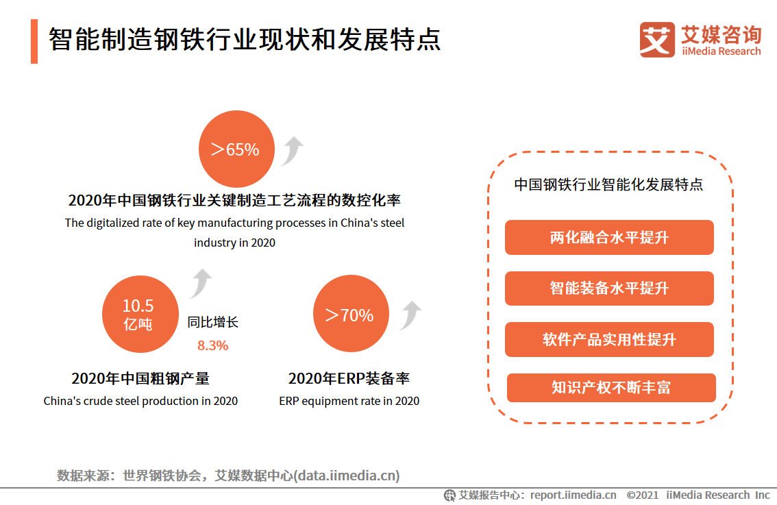 中國已成鋼鐵生產(chǎn)大國,數(shù)據(jù)顯示,2020年中國粗鋼產(chǎn)量達(dá)到10.5億噸,同比增長8.3%。同時中國鋼鐵制造行業(yè)信息化程度大大提高,關(guān)鍵制造工藝流程的數(shù)控化率超過65%,而ERP裝備率也超過了70%。在中國鋼鐵制造行業(yè)與數(shù)字服務(wù)商的共同努力下,中國鋼鐵制造行業(yè)在產(chǎn)量和生產(chǎn)流程數(shù)字化上都有很大的進(jìn)展,數(shù)字化和智能化融合、智能裝備水平都顯著提升,工業(yè)軟件不斷推陳出新,知識產(chǎn)權(quán)也更加豐富。