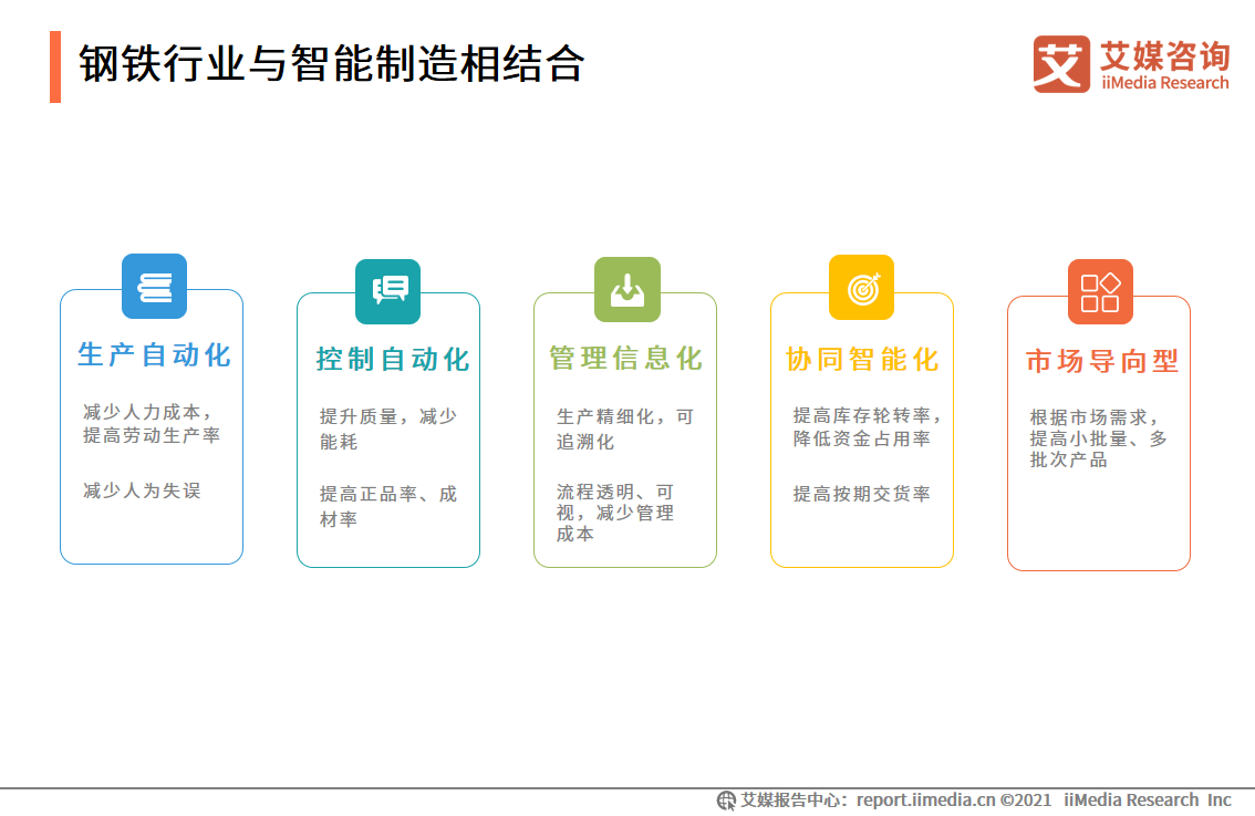智能制造行業(yè)主要在生產(chǎn)自動化、控制自動化、管理信息化、協(xié)同智能化和市場導(dǎo)向方面給予鋼鐵產(chǎn)業(yè)幫助,逐漸幫助行業(yè)實現(xiàn)了人力成本降低、質(zhì)量提升、損耗降低等效果,也給行業(yè)帶來了新的信息化、數(shù)字化的運營模式和與大數(shù)據(jù)相結(jié)合的市場導(dǎo)向型營銷模式。當(dāng)下鋼鐵產(chǎn)業(yè)數(shù)字化改革,在能做到產(chǎn)業(yè)重組、淘汰落后產(chǎn)能的同時,追求節(jié)能減排、綠色發(fā)展成為行業(yè)主流,也催生了行業(yè)的數(shù)字化和智慧化服務(wù)和方案的需求。此外,智能制造與柔性制造滲透率的增加將提升了企業(yè)對技術(shù)化、數(shù)字化和智慧化精細(xì)化運營的管理需求。