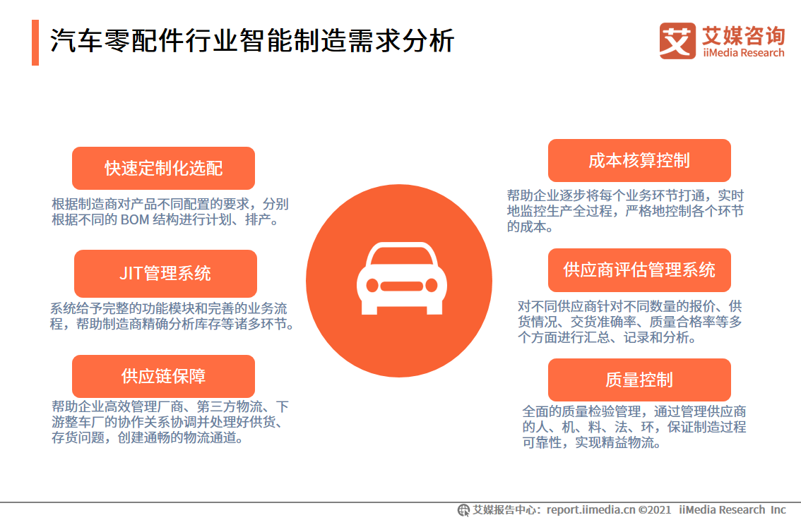 汽車零配件行業(yè)對智能制造的需求主要體現(xiàn)在快速定制化選配生產(chǎn)、JIT管理系統(tǒng)、供應(yīng)鏈保障、成本核算控制、供應(yīng)商評估系統(tǒng)和質(zhì)量控制等六個方面。智能制造將企業(yè)所有經(jīng)營數(shù)據(jù)在同一個數(shù)據(jù)庫集中處理,實現(xiàn)降本提效的同時,能夠及時做出反應(yīng)和決策。同時,智能制造全面提升企業(yè)供應(yīng)鏈運營效率,提高企業(yè)對客戶的快速響應(yīng)能力,并最終以提高汽配企業(yè)生產(chǎn)經(jīng)營經(jīng)濟效益,增加企業(yè)核心競爭能力和抗風(fēng)險能力為目標(biāo)。