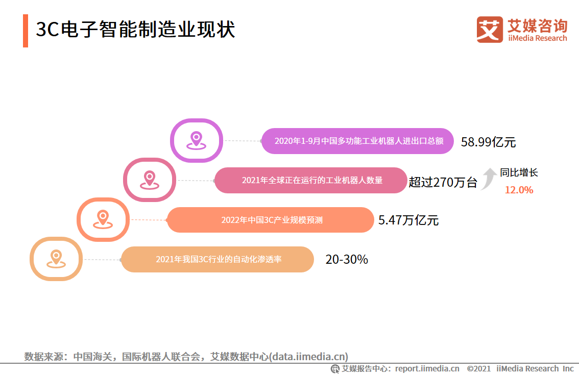 近年來,全球3C電子制造業(yè)不斷進(jìn)行信息化、數(shù)字化和智能化的改革升級,2020年1-9月中國多功能工業(yè)機器人進(jìn)出口總額達(dá)到58.99億元,全球正在運行的工業(yè)機器人數(shù)量也超過了270萬臺,同比增長12.0%。在技術(shù)改革的幫助下,預(yù)計2022年占全球產(chǎn)能70%的我國3C電子智能制造業(yè)規(guī)模將達(dá)到5.47萬億元。雖然技術(shù)改革已初見成效,但是我國3C電子智能制造業(yè)自動化滲透率還不高,僅有覆蓋了20-30%的生產(chǎn)流程。未來行業(yè)將進(jìn)一步進(jìn)行數(shù)字化、智能化的改革,減少人力成本,進(jìn)一步釋放產(chǎn)能。