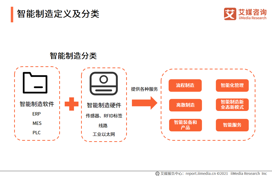 綜合來說,智能制造分為軟件和硬件。智能制造軟件系統(tǒng)主要包括制定計劃、調(diào)配資源的ERP系統(tǒng),以及負(fù)責(zé)信息傳遞的PLC系統(tǒng)和連接ERP、PLC等系統(tǒng)、控制生產(chǎn)的MES系統(tǒng);智能制造硬件主要包括采集信息的傳感器、RFID標(biāo)簽和傳輸信息的線路、工業(yè)以太網(wǎng)。智能制造企業(yè)主要提供流程制造、離散制造、智能裝備和產(chǎn)品、智能化管理、智能服務(wù)和智能制造新業(yè)態(tài)模式等服務(wù)。