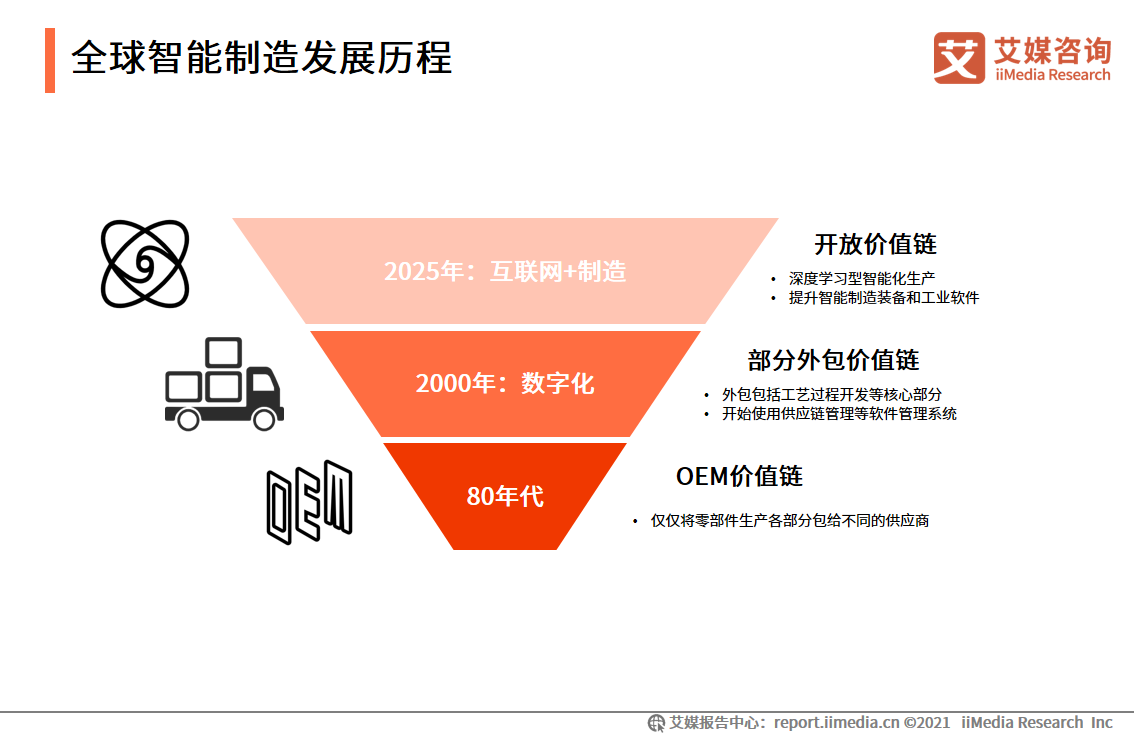 全球智能制造行業(yè)發(fā)展歷經(jīng)三個階段。從1980年代開始,僅將零部件生產(chǎn)包給不同供應(yīng)商的OEM價值鏈,發(fā)展至2020年,外包包括生產(chǎn)鏈核心部分,開始使用軟件管理系統(tǒng)的數(shù)字化制造時代。未來,智能制造領(lǐng)域?qū)⑼_放價值鏈的方向發(fā)展。隨著5G、大數(shù)據(jù)和深度學(xué)習(xí)等技術(shù)領(lǐng)域的發(fā)展和應(yīng)用,服務(wù)商將不僅提供某些關(guān)鍵生產(chǎn)環(huán)節(jié)的服務(wù),還將往設(shè)計、原型制造、零部件生產(chǎn)和系統(tǒng)集成等領(lǐng)域發(fā)展,智能制造裝備和工業(yè)軟件技術(shù)水平也將顯著增強。