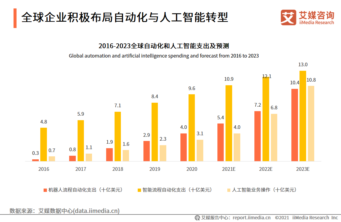 隨著全球自動化、人工智能等技術(shù)的發(fā)展,各國企業(yè)在自動化和人工智能領(lǐng)域的支出也隨之增加。全國企業(yè)的機器人流程自動化支出從2016年的3億美元上漲至2020年的40億美元,預(yù)計將在2023年上升至104億美元;全國企業(yè)的智能流程自動化支出從2016年的48億美元上漲至2020年的96億美元,預(yù)計將在2023年上升至130億美元;全國企業(yè)的人工智能業(yè)務(wù)操作方面的支出從2016年的7億美元上漲至2020年31億美元,預(yù)計將在2023年上升至108億美元。艾媒咨詢分析師認(rèn)為,自動化、人工智能和傳統(tǒng)產(chǎn)業(yè),尤其是制造業(yè)的結(jié)合將是未來企業(yè)提升用工效率和競爭力的重要要素。