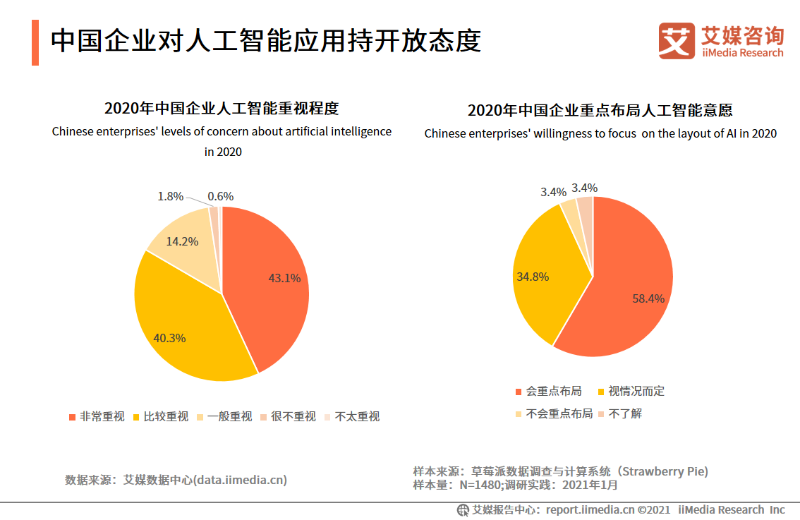 iiMedia Research(艾媒咨詢)數(shù)據(jù)顯示,2020年,43.1%的受訪企業(yè)表示對人工智能非常重視,且超95%的受訪企業(yè)表示重視人工智能成果的應(yīng)用;58.4%的中國企業(yè)表示會重點布局人工智能領(lǐng)域。艾媒咨詢分析師認(rèn)為,中國企業(yè)界對人工智能應(yīng)用持開放和總體樂觀的態(tài)度,為該領(lǐng)域企業(yè)后續(xù)發(fā)展應(yīng)用提供了良好用戶基礎(chǔ)。