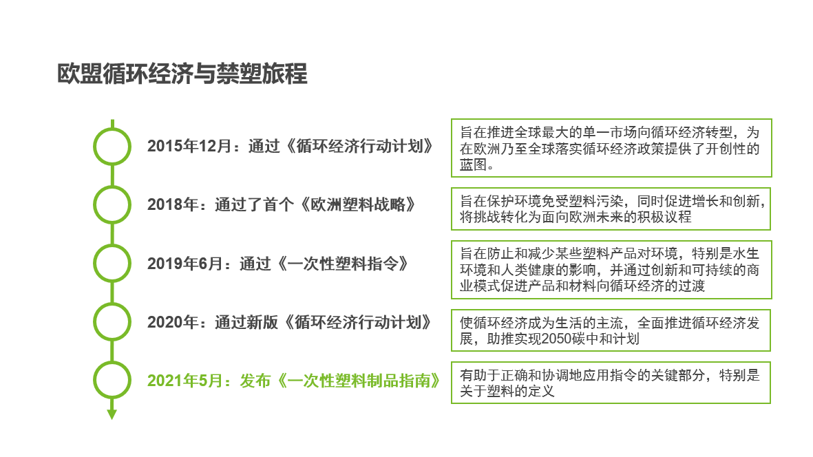 當(dāng)我們回溯歐盟的相關(guān)法令可以發(fā)現(xiàn),從2015年的《循環(huán)經(jīng)濟(jì)行動(dòng)計(jì)劃》到《歐洲塑料戰(zhàn)略》、《一次性塑料法令》等等,對(duì)塑料的使用、限制都在一步步加強(qiáng),歐盟通過推廣環(huán)保新材料、開征塑料稅、制定碳中和目標(biāo)、重新定義塑料范疇等不同方式,力圖對(duì)塑料的生產(chǎn)、使用、消費(fèi)、回收形成一個(gè)閉環(huán)的管理和引導(dǎo)。