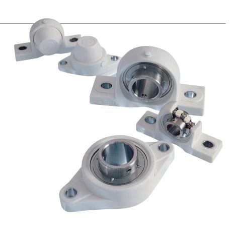 除上述不銹鋼、塑料材質(zhì)軸承及軸承座外,食品機械亦常使用合成樹脂滑動軸承,樹脂材質(zhì)滑動軸承自潤滑效果佳,因沒有填充潤滑脂,因此就沒有泄漏的可能,常用于高溫環(huán)境(潤滑脂的極限高溫約100度,而樹脂滑動軸承可耐300度的高溫),如高溫殺菌設(shè)備。