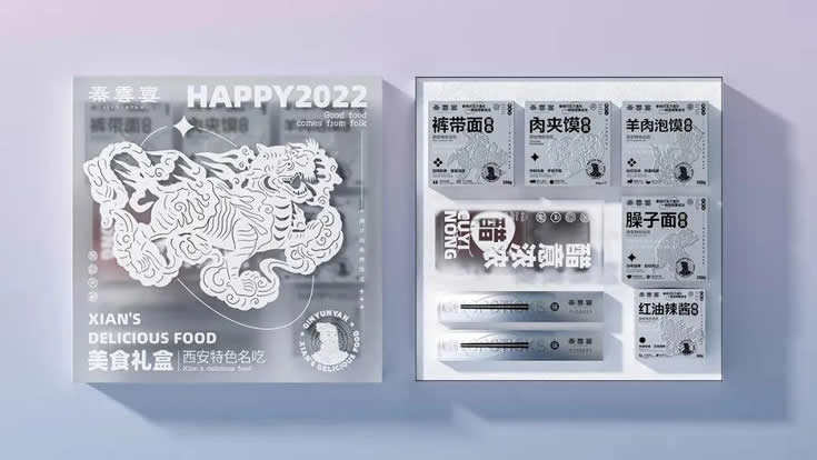 銀灰色的禮盒營(yíng)造出高級(jí)質(zhì)感,封面排版采用不同類型的字體設(shè)計(jì)來區(qū)分產(chǎn)品信息。版面還結(jié)合了傳統(tǒng)剪紙,給每款面食都搭配有相應(yīng)的瑞獸形象,刺激人們對(duì)產(chǎn)品的味覺聯(lián)想。