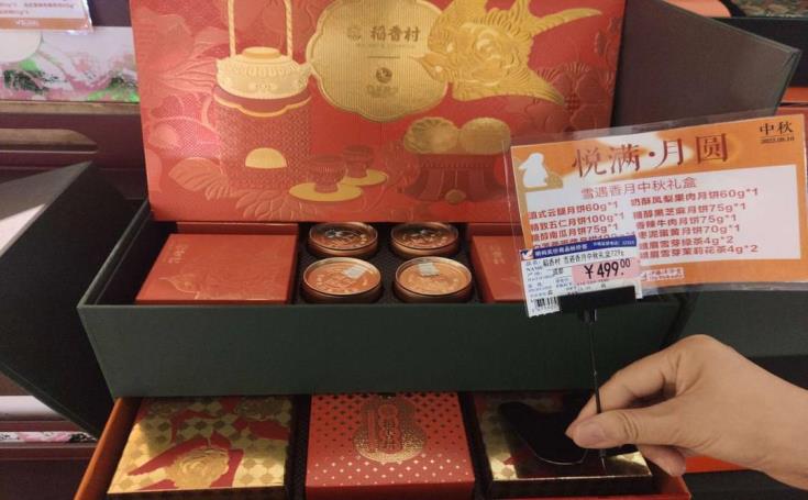 一款標(biāo)價389元的“稻香如意(糕點、什錦果仁)中秋禮盒”,含酥皮云腿餅、鳳梨酥餅、堅果等食品,其包裝上雖未出現(xiàn)“月餅”字樣,但超市價簽上明白標(biāo)注“稻香村稻香如意月餅禮盒”。