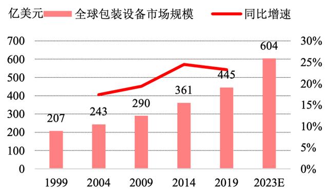 全球包裝設(shè)備行業(yè)規(guī)模接近500億美元,其中食品、飲料以及醫(yī)療為最主要下游應(yīng)用領(lǐng)域。根據(jù)The Freedonia Group,Inc報(bào)告,2019年全球包裝設(shè)備市場規(guī)模約445億美元,并預(yù)計(jì)在2023年達(dá)到604億美金,預(yù)計(jì)整體保持5%左右的年均增速。從地區(qū)來看,根據(jù)其預(yù)測發(fā)展中國家和地區(qū)包裝設(shè)備銷量的增長將成為全球包裝設(shè)備發(fā)展的推動(dòng)力,中國作為最大的發(fā)展中國家,對包裝設(shè)備的需求將構(gòu)成世界最大的市場之一;從下游應(yīng)用領(lǐng)域來看,2019年全球包裝設(shè)備機(jī)械中前三大終端應(yīng)用領(lǐng)域分別為食品、飲料、醫(yī)療,分別占33.5%、24.0%、12.0%。