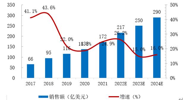2017-2022年全球服務(wù)機(jī)器人市場(chǎng)銷(xiāo)售額及增速