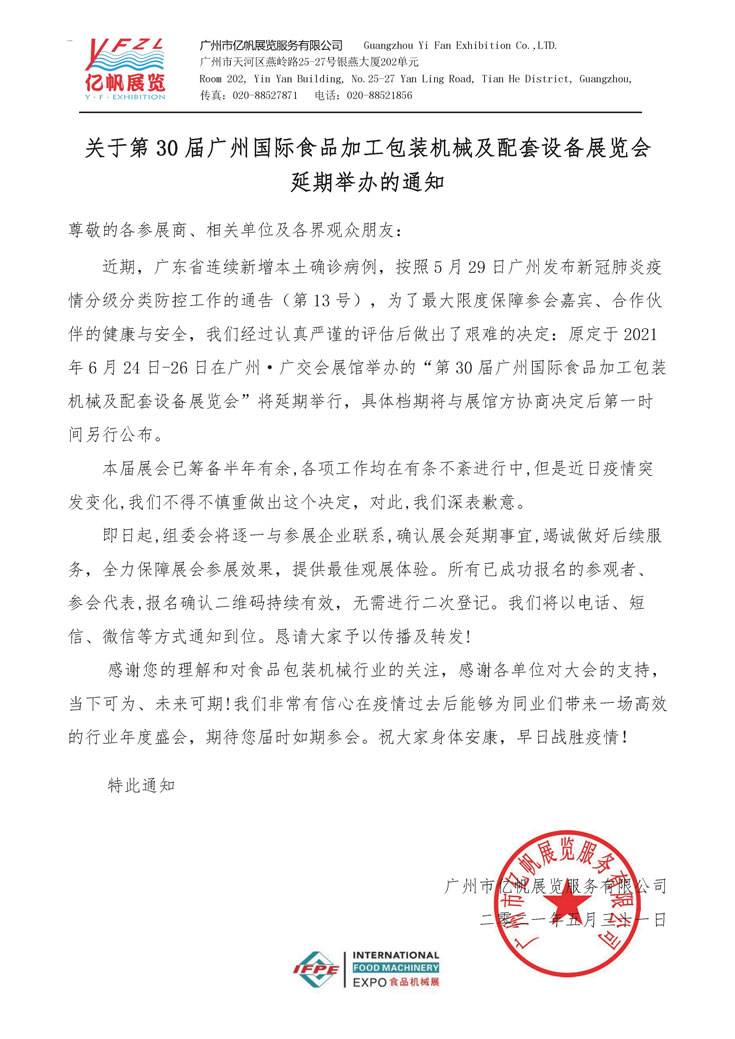 關(guān)于第30屆廣州國際食品加工包裝機械及配套設(shè)備展覽會延期舉辦通知
